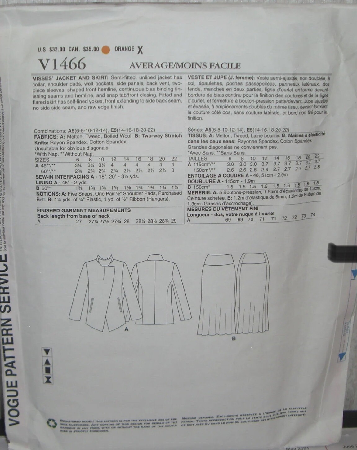 Womens Misses Jacket Amp Skirt Suit Sewing Pattern Vogue V1466 Sz 14 22 Ucn Ebay